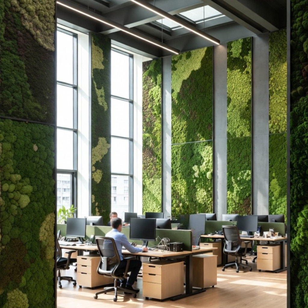 Líquenes (Reindeer Moss): Los campeones de la absorción acústica debido a su extrema porosidad. Permiten una flexibilidad cromática total para adaptarse a la paleta corporativa.
